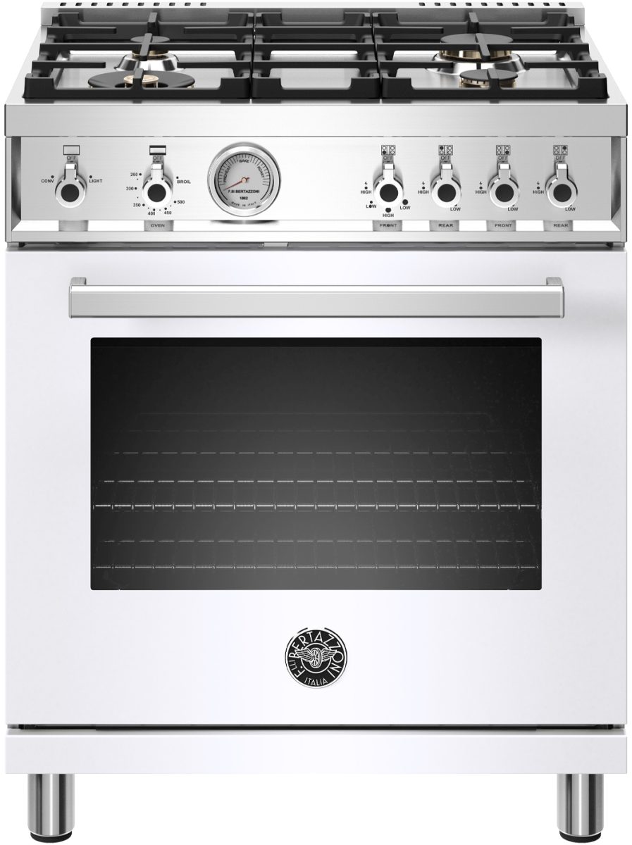 The new Bertazzoni ranges are superb cooking appliances designed, engineered and made in Italy. All Bertazzoni appliances integrate seamlessly into style-harmonized suites for a true, high-performing kitchen. The high-efficiency maintop with 4 brass burners features a dual ring 19,000 BTU power-burner that boils water in under 6 minutes (best in class), and 3 additional MonoBloc burners of variable size and power to suit every style of cooking, with delicate simmer at 750 BTUs. The 4.7 cubic feet oven cavity is the largest in its class, with dual convection fan for balanced airflow and even temperature baking and roasting on 7 shelf levels. The elegant large temperature gauge monitors the actual temperature in the oven. The extra wide infrared gas broiler is ideal for grilling and searing at high heat. The oven includes convenient features such as smooth telescopic glides for the oven shelves and soft-close doors. The edge-to-edge interior oven glass door maximizes interior volume and can be wiped clean without effort. All Bertazzoni appliances are covered by a 2-year warranty. Products and packaging are 99% recyclable.